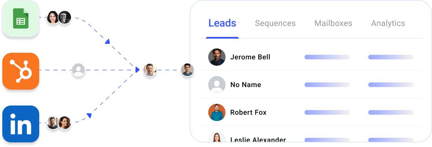 Easily bring your leads together from any source—upload a CSV, connect your CRM, or add manually. Keep every prospect organized in a single inbox, so you can launch your outreach campaigns instantly.