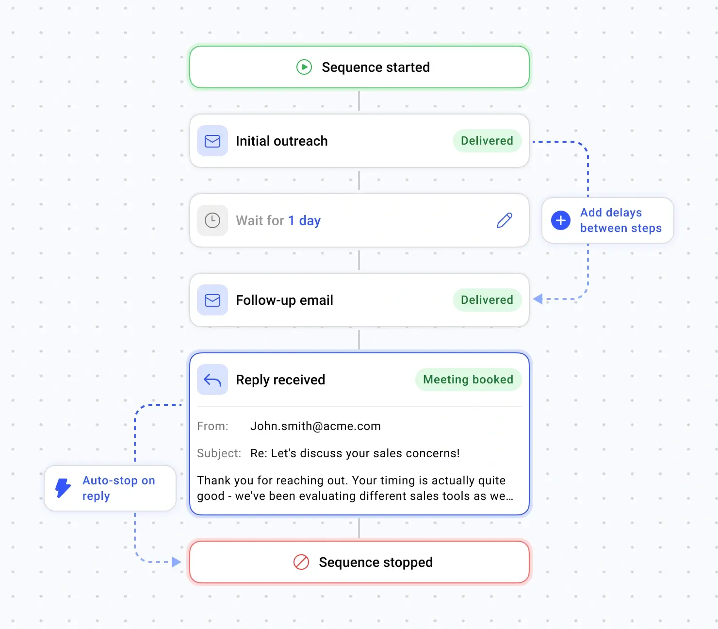 Build outreach sequences that adapt automatically based on prospect behavior—no manual intervention needed.